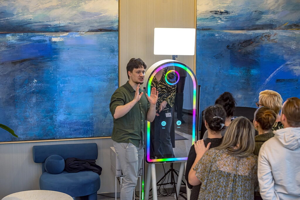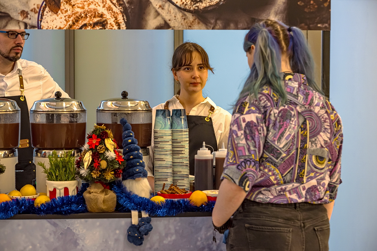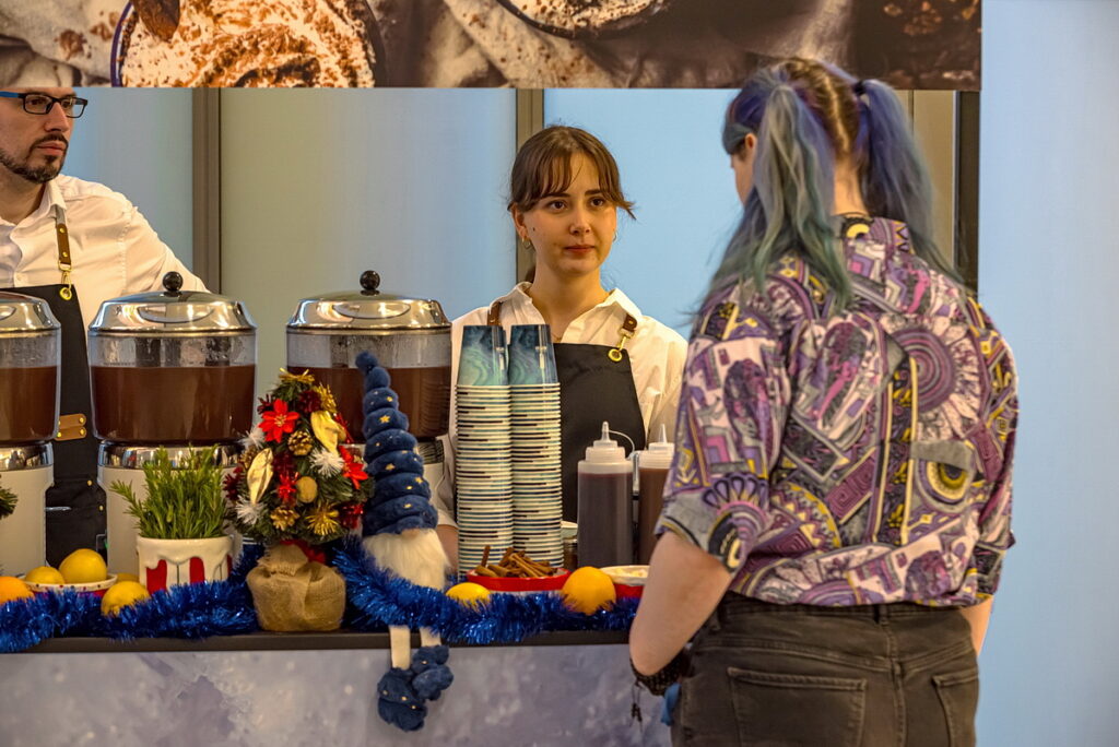 Na uczestników czekała fotobudka AI, stoisko z gorącą czekoladą oraz okolicznościowy tort.
